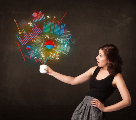 Businesswoman standing and holding a white cup with diagrams and graphs coming out of the cup