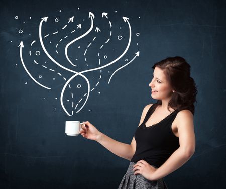 Businesswoman standing and holding a white cup with drawn lines and arrows coming out of the cup