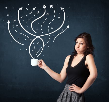 Businesswoman standing and holding a white cup with drawn lines and arrows coming out of the cup