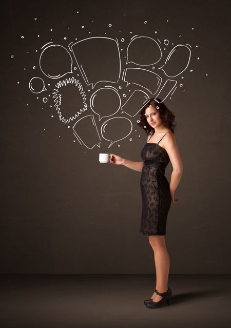 Businesswoman standing and holding a white cup with drawn speech bubbles coming out of the cup
