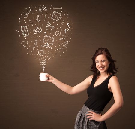 Businesswoman standing and holding a white cup with drown social media icons coming out of the cup
