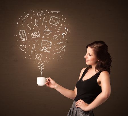 Businesswoman standing and holding a white cup with drown social media icons coming out of the cup