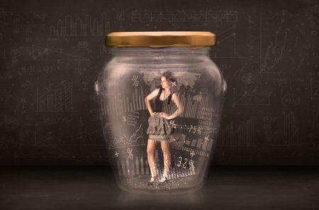 Businesswoman traped in jar with graph chart symbols concept on background