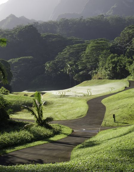 Cart path along fairway with morning dew and cart tracks on tropical golf course
