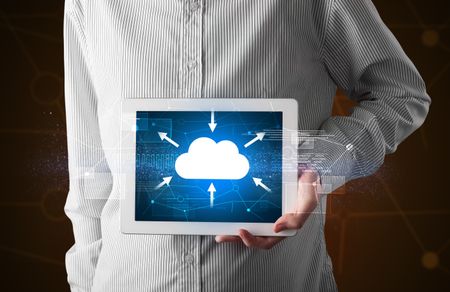 Casual businessman holding tablet with cloud concept