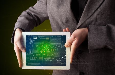 Casual businessman holding tablet with strategy and business related graphics
