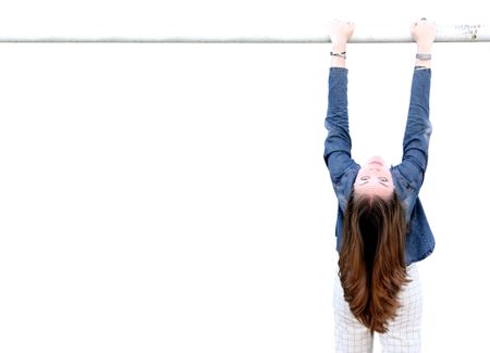 casual female hanging from a bar