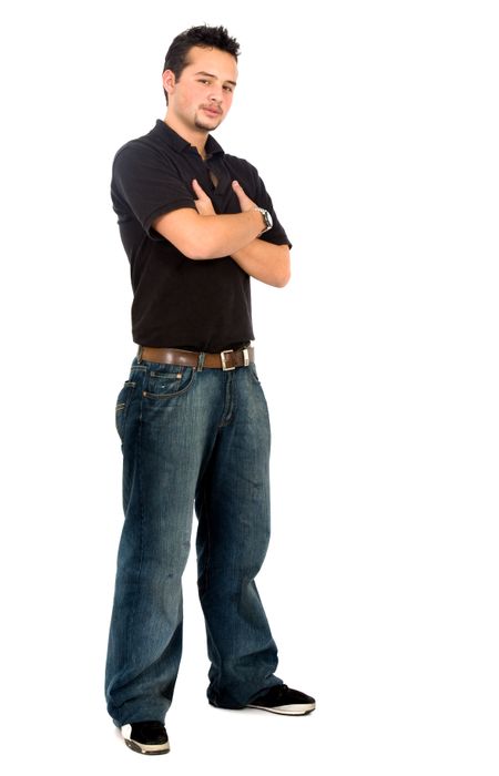 Casual friendly man in yellow and blue standing – isolated over a white background