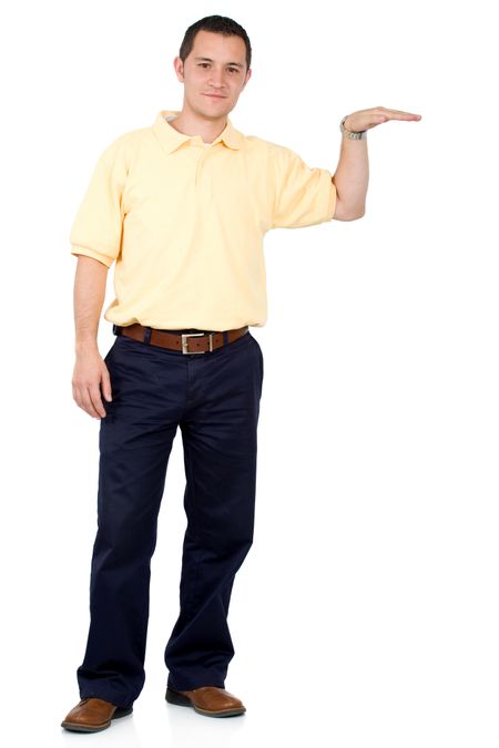 Casual friendly man in yellow and blue standing displaying something – isolated over a white background