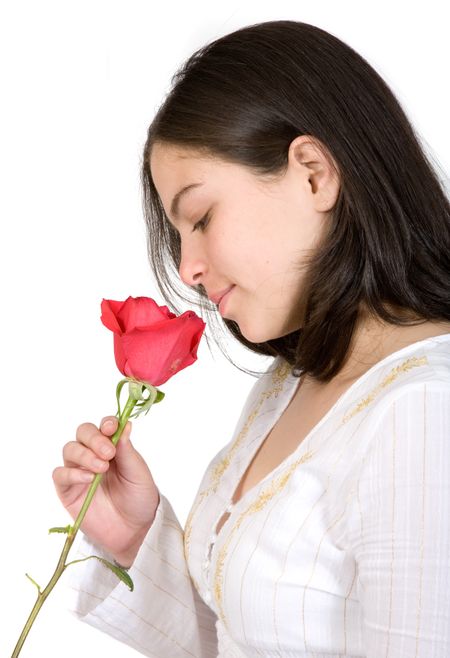 casual girl holding a red rose in a very deep and thoughtful mood - over a white background