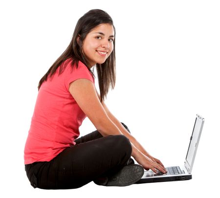 Casual girl on a laptop working on the floor over a white background