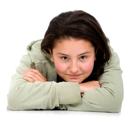 Casual girl portrait on the floor isolated over a white background
