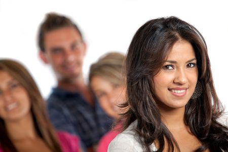 Casual girl portrait in front of a group of friends isolated on white