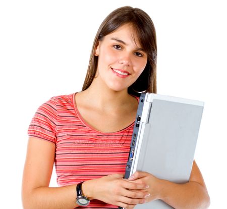 Casual girl smiling and holding a laptop computer isolated over a white background