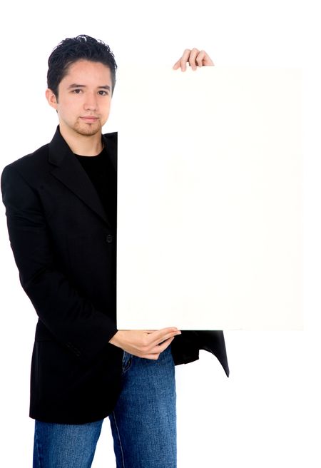casual guy holding a board over a white background