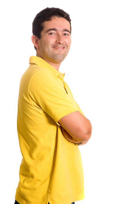 Casual guy in yellow clothes over a white background