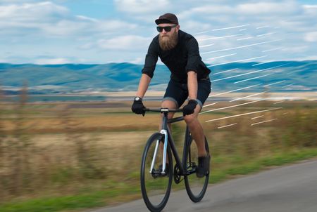 Casual hipster cyclist riding bicycle with high speed concept