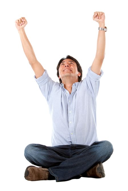 casual man full of success with his arms up isolated over a white background
