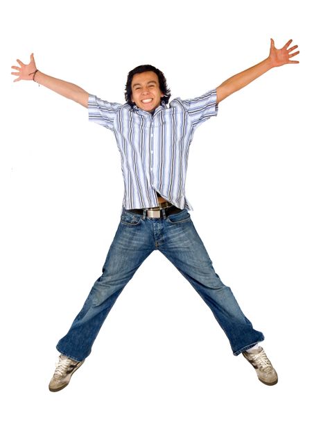 casual man jumping in the air with his arms open and a big smile on his face - isolated over a white background
