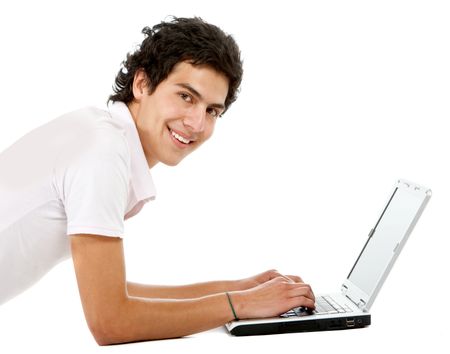 Casual man on a laptop working on the floor over a white background