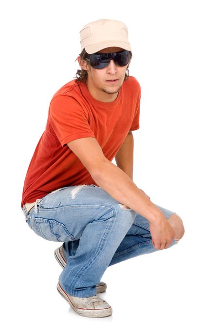 casual man portrait wearing a cap and sunglasses - isolated over a white background