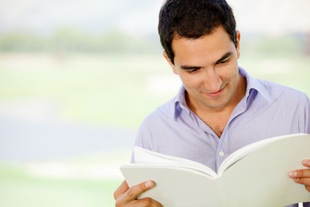 Casual man reading a book outdoors and smiling