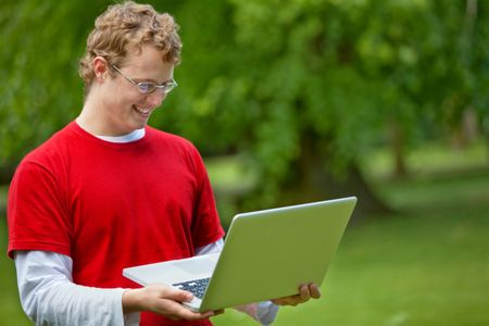 Casual man smiling and carrying a laptop outdoors