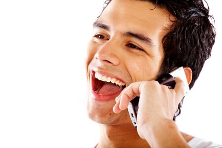 casual man smiling and talking on a mobile phone isolated over a white background