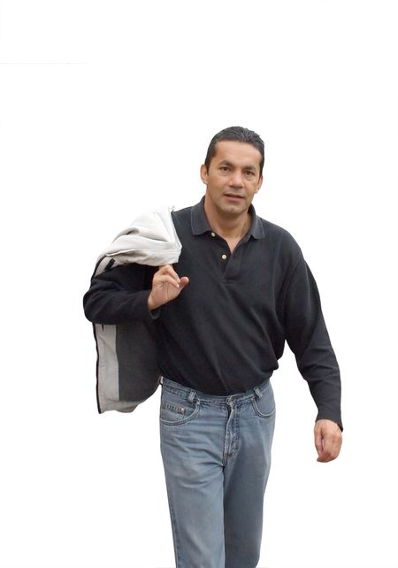 casual man walking with jacket on shoulder