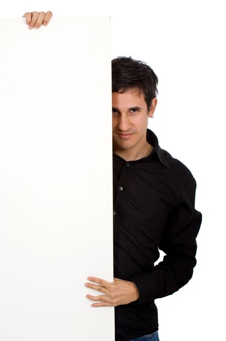 casual man behind a white board isolated over a white background