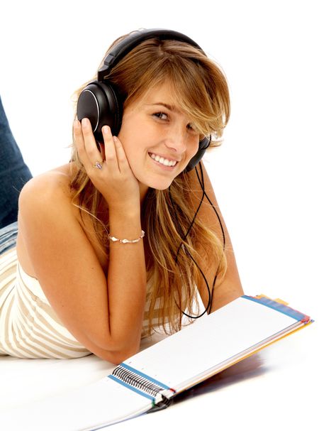 Casual student listening to music while studying isolated over a white background