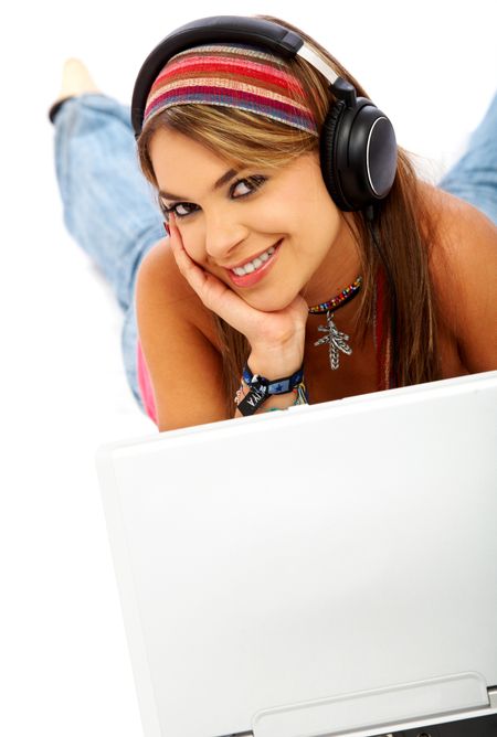 Casual student smiling and listening to music on the computer while studying isolated over a white background