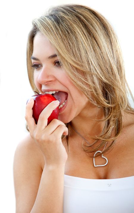 casual woman with an apple over a white background