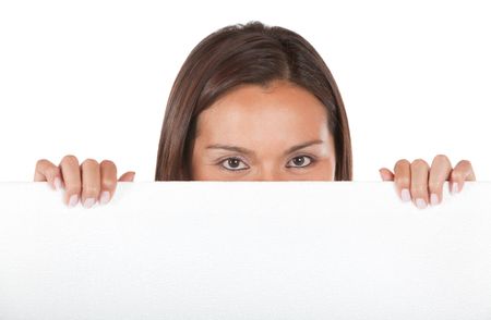 casual woman displaying a banner ad isolated over a white background