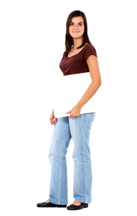 casual woman displaying a banner add isolated over a white background