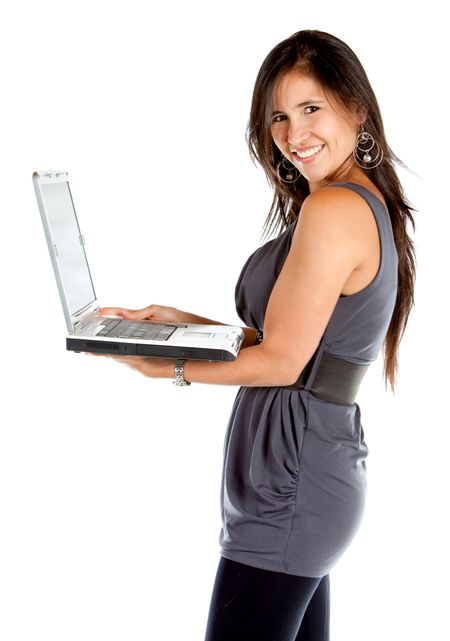 Casual woman holding a laptop and smiling - isolated over white
