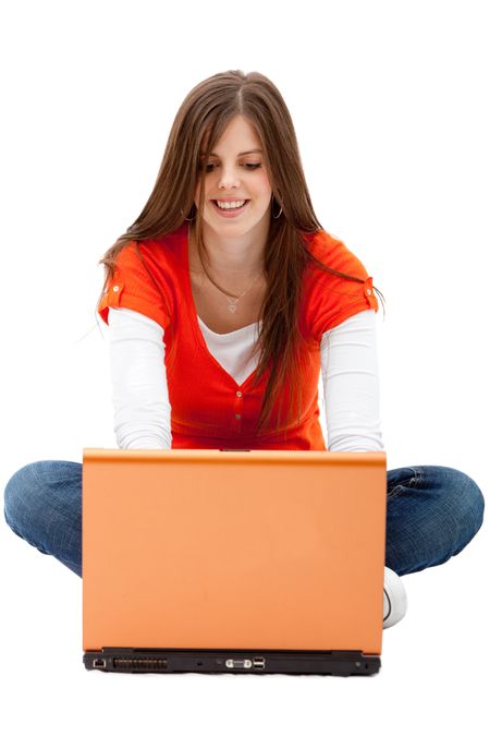 Casual woman with a laptop isolated over a white background