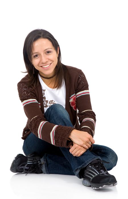 Casual woman portrait sitting on the floor isolated over a white background