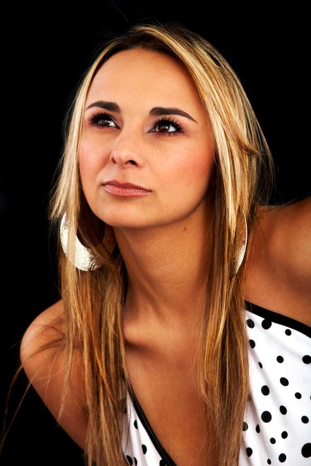 casual woman portrait wearing make up looking up with a pensive face