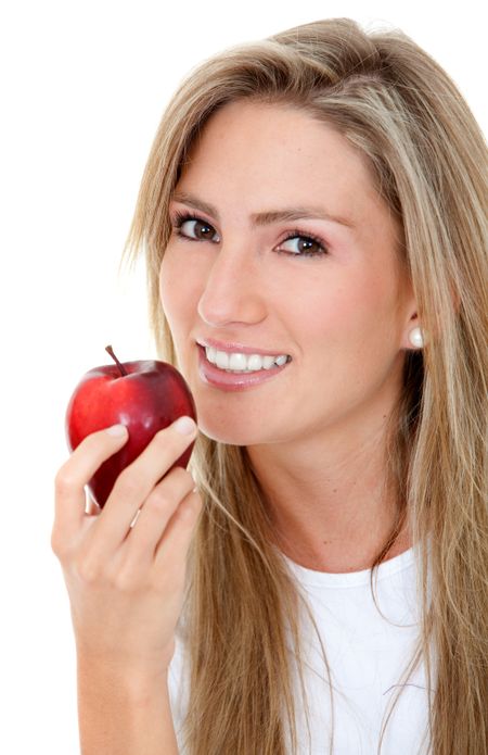 casual woman with a red apple isolated over white
