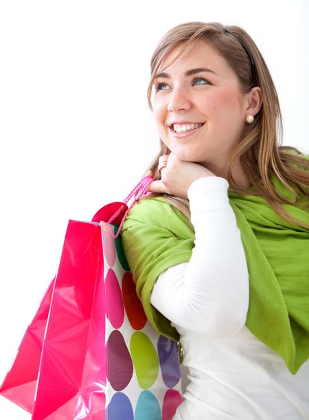Casual woman with shopping bags isolated on white