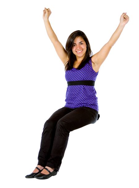 casual woman sitting on something with her arms up
