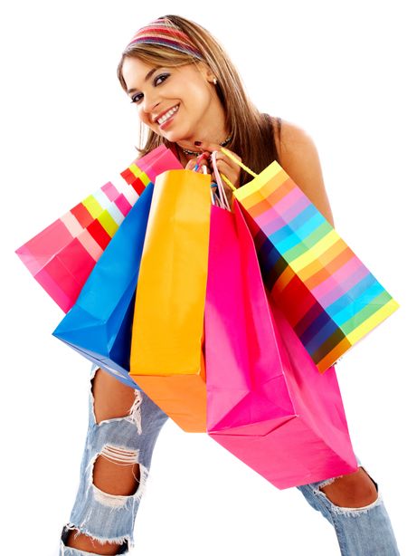 Casual woman smiling and carrying shopping bags isolated over a white background