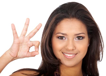 casual woman smiling doing the ok sign isolated over a white background