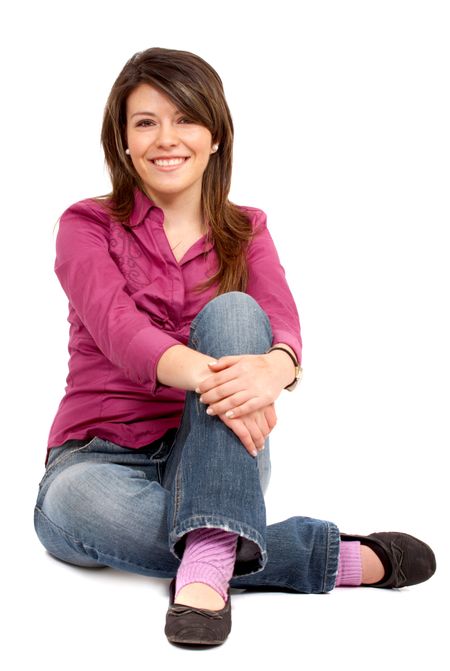 casual woman smiling on the floor isolated over a white background