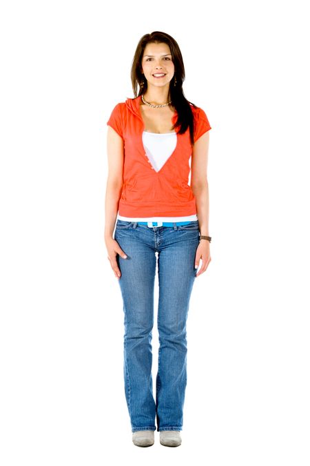 casual woman smiling and standing isolated over a white background
