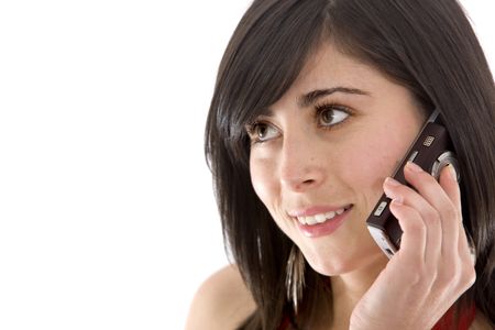 casual woman smiling and talking on a mobile phone - isolated over a white background
