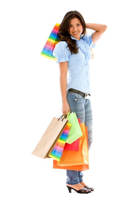 Casual woman standing with shopping bags isolated over a white background