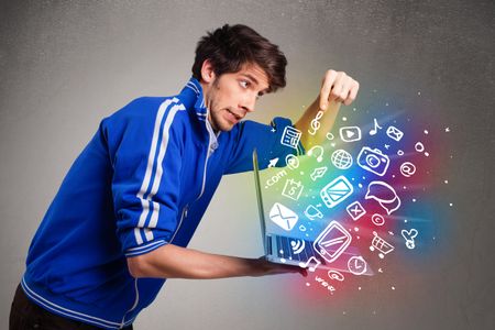 Casual young man holding laptop with colorful hand drawn multimedia symbols