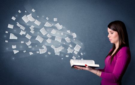 Casual young woman holding book with pages flying out of it